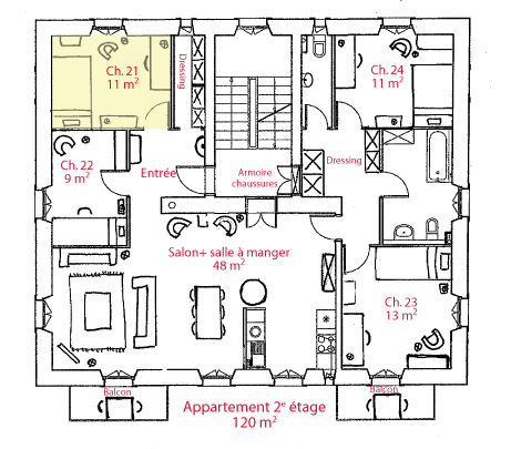 Room 21 is furnished with a bed (140x200 cm) with drawers, a desk + chair, a bookcase, a chest of drawers and an armchair. There is a personal wardrobe in the hall and 48 m2 of communal areas.