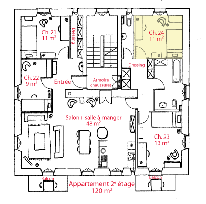 Room 24 is furnished with a bed (140x200 cm) with drawers, a desk + chair, a bookcase, a chest of drawers and an armchair. There is a personal wardrobe in the hall and 48 m2 of communal areas.